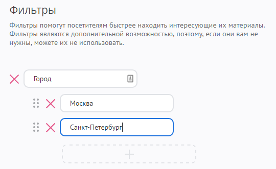 Введите название фильтра и значения для него. Например, в качестве названия фильтра можно написать «Город», а в качестве значений — перечень городов: