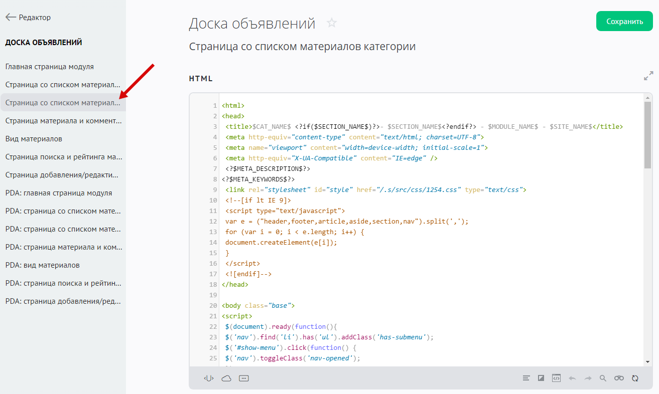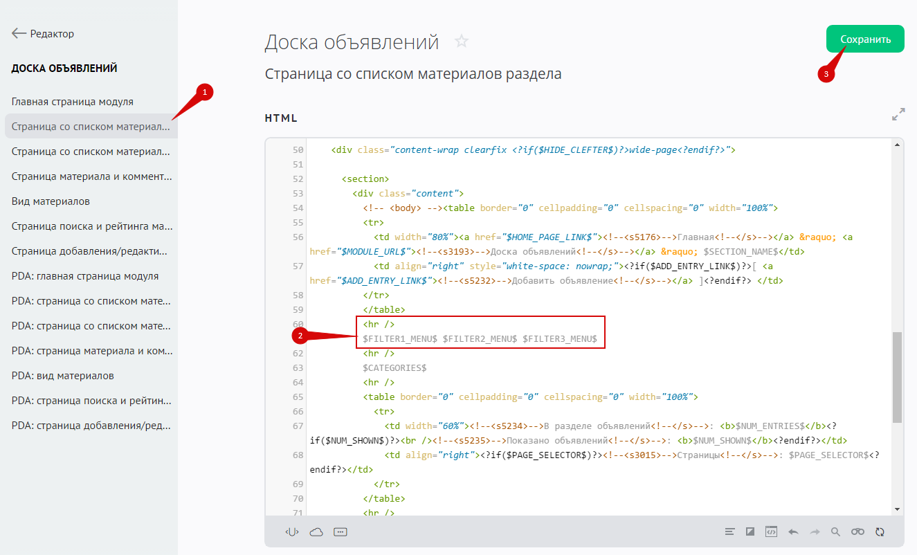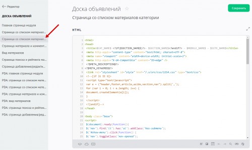 Что делать, если фильтры не отображаются на сайте?Если вы выполнили все шаги инструкции, но фильтры на сайте так и не появились, зайдите в раздел «Дизайн» / «Редактор» / «Доска объявлений» и найдите в списке шаблон «Страница со списком материалов категории»: