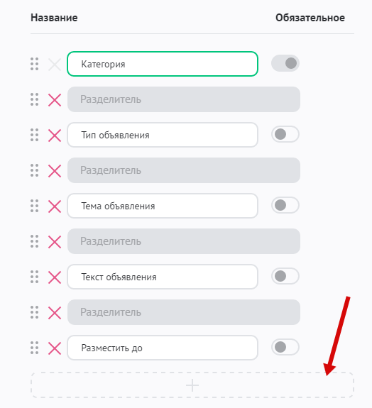 В форме добавления уже присутствует фильтр «Тип предложения». Чтобы добавить еще один фильтр, нажмите на область с изображением «+» под списком полей: