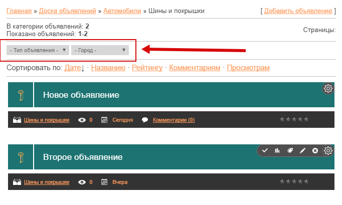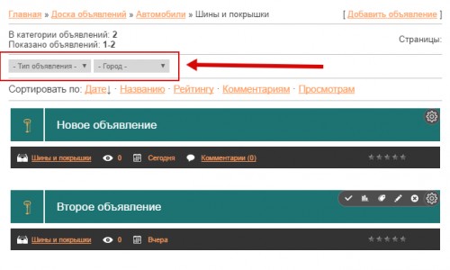 На данном шаге мы посмотрим, как выглядят фильтры на страницах модуля. Для этого перейдите в любую категорию доски объявлений. Местоположение фильтров зависит от того, как они размещены в шаблоне. Обычно их можно найти в верхней части списка материалов: