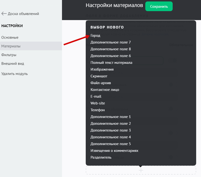 Чтобы появилась возможность указывать фильтры для материалов, нужно добавить поле «Фильтр» на страницу добавления материала. В настройках модуля выберите раздел «Материалы» и найдите заголовок «Поля в форме добавления»: