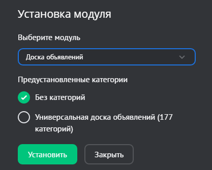 Выберите модуль «Доска объявлений» и укажите предустановленные категории: