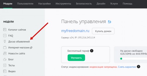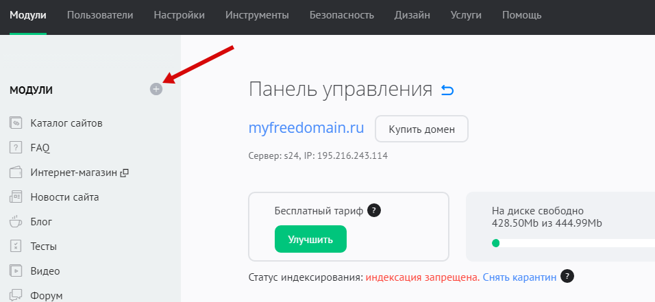 Чтобы подключить модуль, войдите в панель управления сайтом. На главной странице панели в левой колонке «МОДУЛИ» нажмите на изображение «+»: