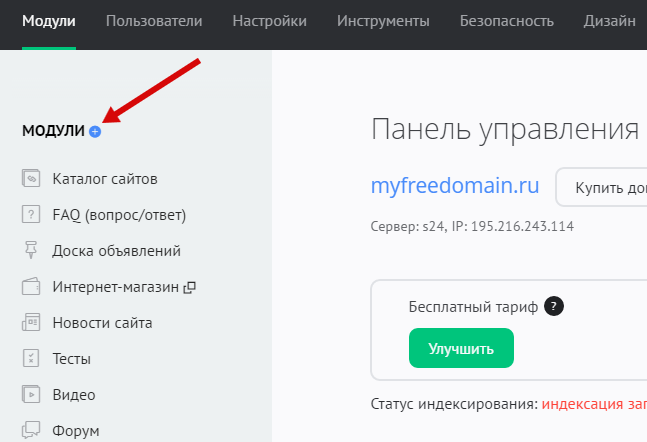 Чтобы подключить модуль, войдите в панель управления сайтом. На главной странице панели в левой колонке «МОДУЛИ» нажмите на изображение «+»: