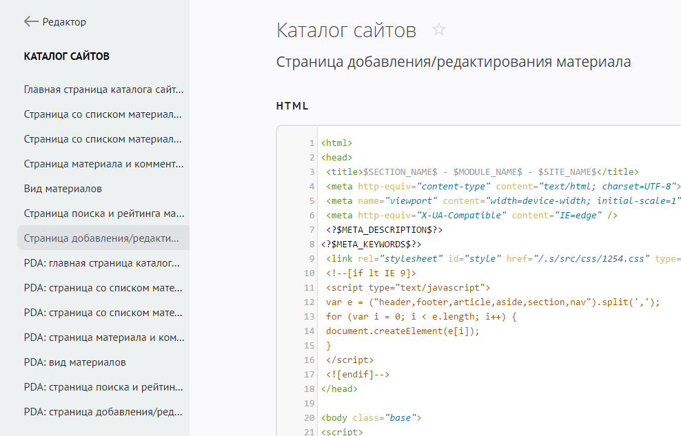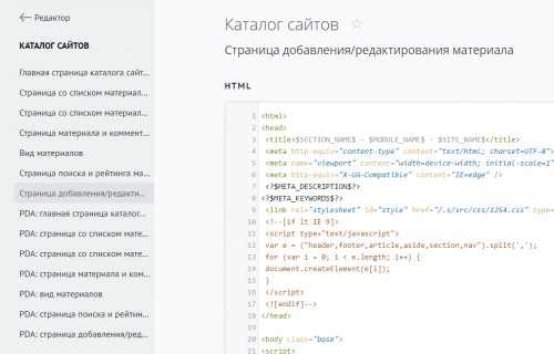 Шаблон «Вид материалов» отвечает за показ анонсов добавленных сайтов. Все добавленные на сайт материалы в соответствии с заданным в шаблоне видом помещаются в переменную $BODY$, которая используется в следующих шаблонах:
