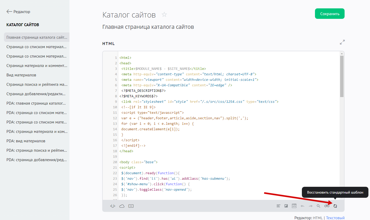 Если в процессе правки одного из шаблонов вы захотите отменить внесенные изменения, воспользуйтесь кнопкой «Восстановить стандартный шаблон»: