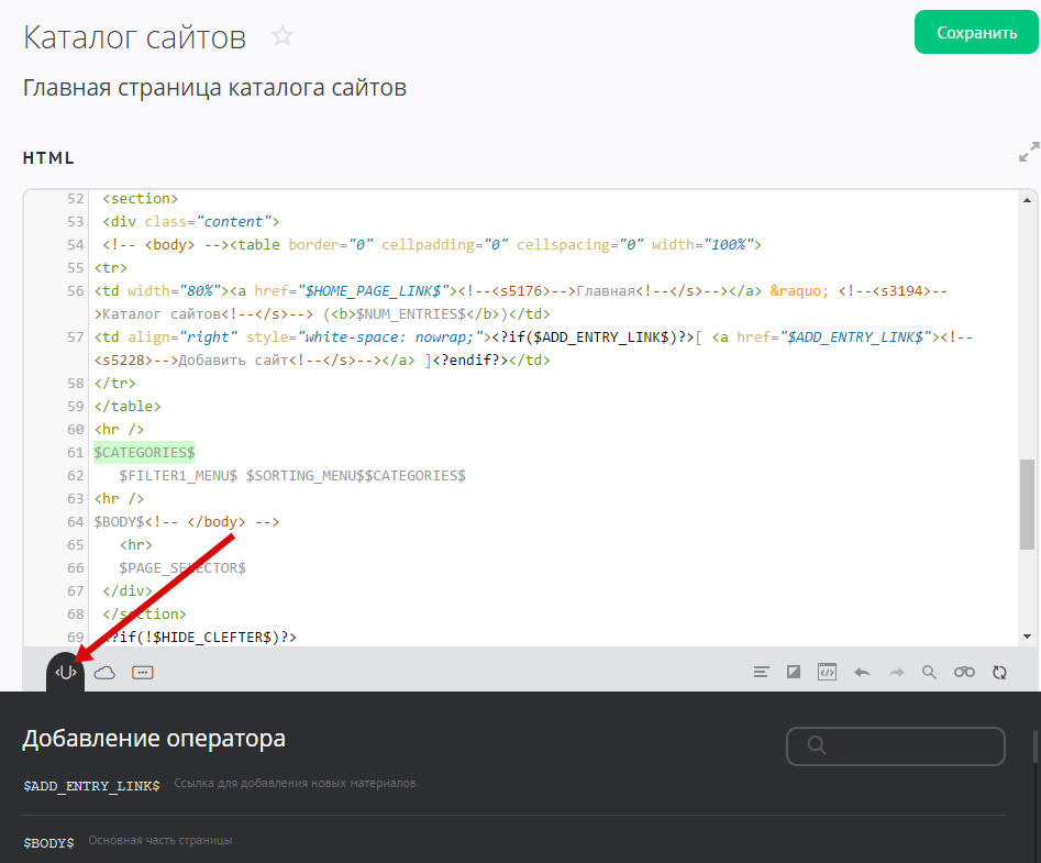 В каждом из шаблонов модуля используется свой набор переменных. Они могут выполнять разные функции и выводить различную информацию. При работе с шаблоном вы в любой момент можете посмотреть список действующих переменных, нажав на значок в редакторе: