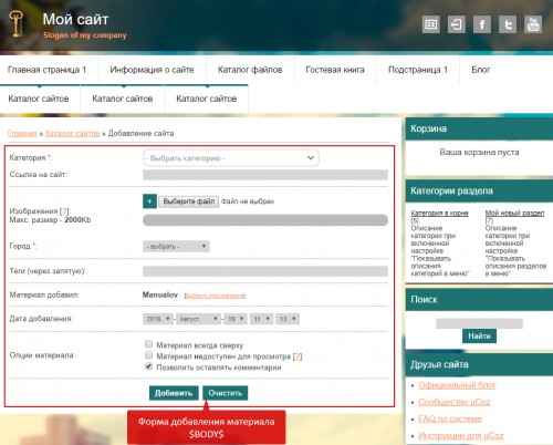 Главным содержимым страницы является форма добавления материала. Ее вид задается с помощью набора полей в настройках модуля. Все поля формы выводятся с помощью переменной $BODY$: