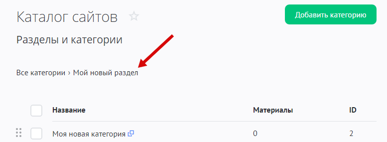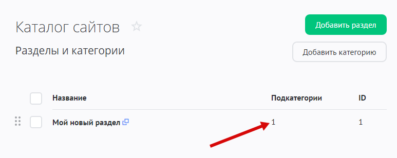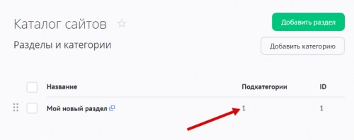 После указания информации нажмите на кнопку «Добавить». Если категория была добавлена в раздел, то в строке напротив нее увидите, что количество в колонке «Подкатегории» увеличилось: