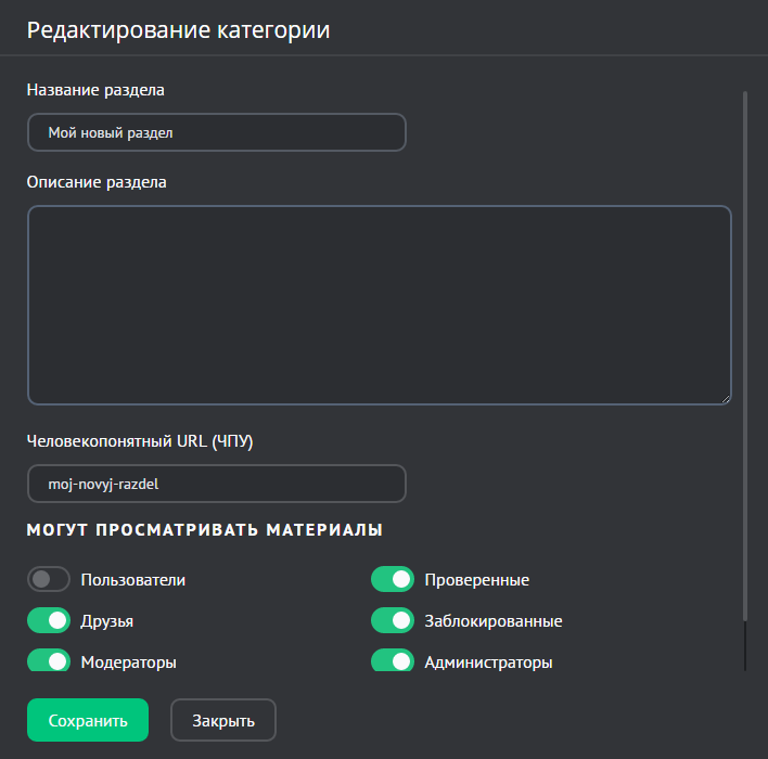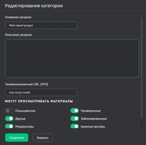 - Права доступа к разделу. Указываются группы пользователей, которым разрешается просматривать раздел.
