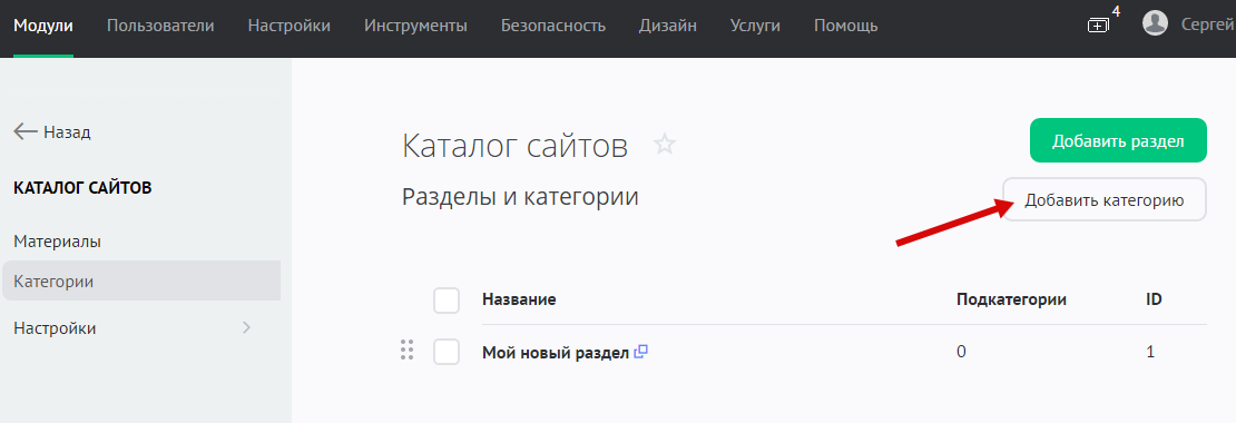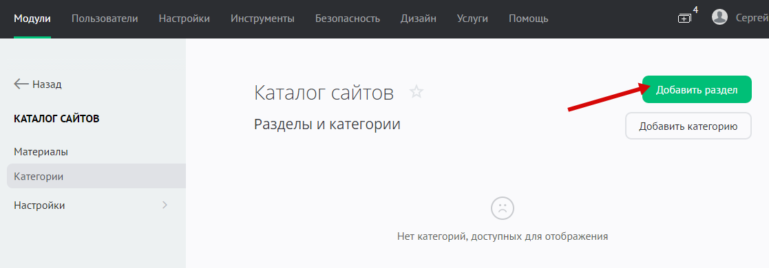 На странице «Модули» / «Каталог сайтов» / «Категории» нажмите на кнопку «Добавить раздел»:
