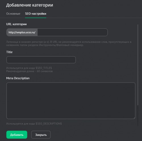 - SEO-настройки. Доступны после оплаты любого тарифа, кроме «Базовый», и включения «Уникальные Title, Description, Keywords» в SEO-модуле.