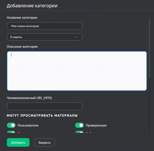 - Права доступа к категории. Указываются группы пользователей, которым разрешается просматривать, добавлять материалы и скачивать файлы категории.