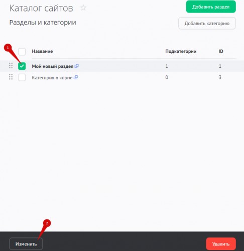 На странице «Модули» / «Каталог сайтов» / «Категории» отметьте категорию или раздел, который хотите изменить, и нажмите на кнопку «Изменить»: