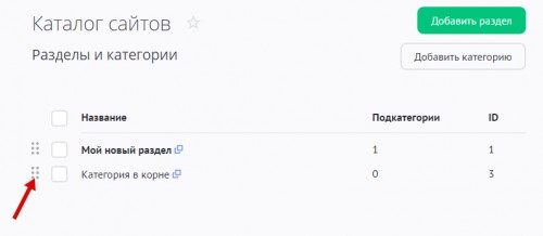 Перейдите на страницу «Модули» / «Каталог сайтов» / «Категории». В списке категорий потяните за иконку и переместите раздел или категорию вверх/вниз: