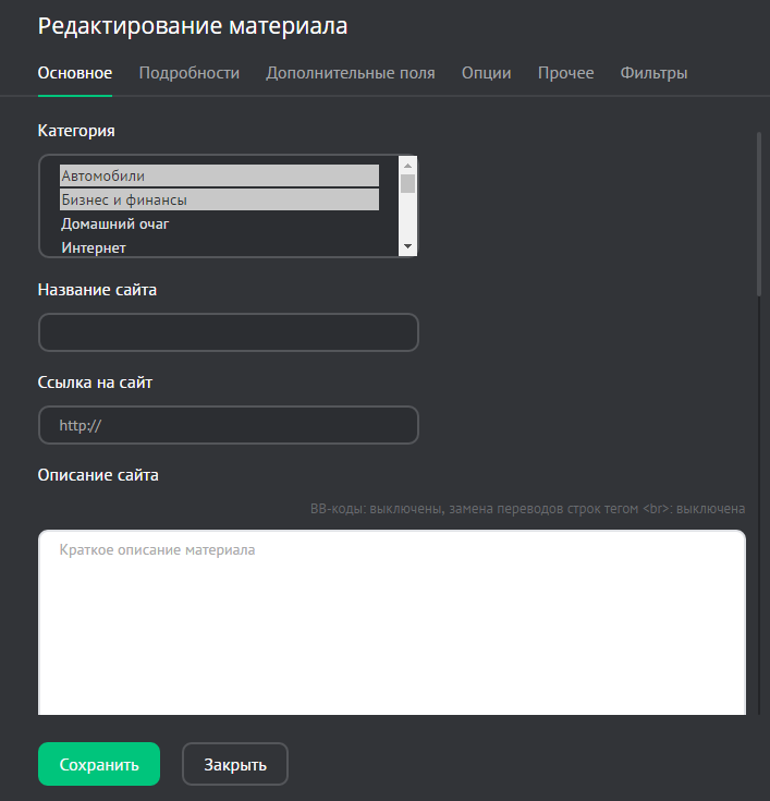 Измените данные, которые прикреплены к сайту, и нажмите на кнопку «Сохранить». Чтобы узнать больше о полях, которые могут быть прикреплены к сайту, читайте инструкцию о добавлении сайта в каталог.