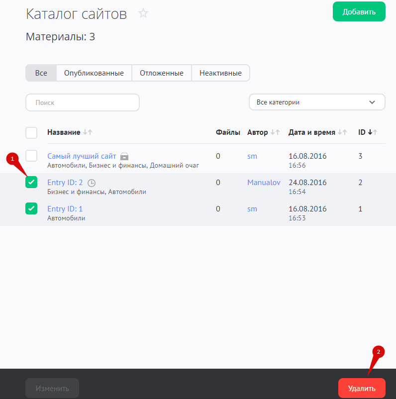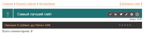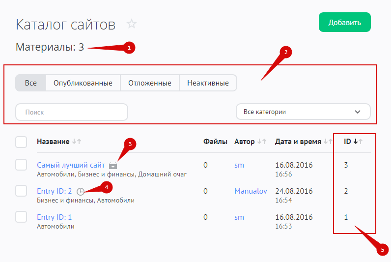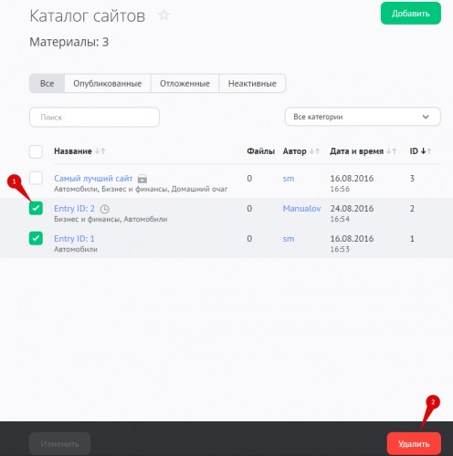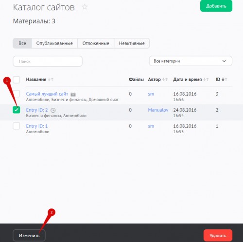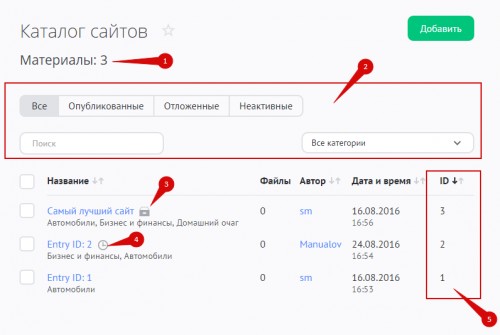 Управление добавленными в каталог сайтами выполняется в разделе «Модули» / «Каталог сайтов» / «Материалы»: