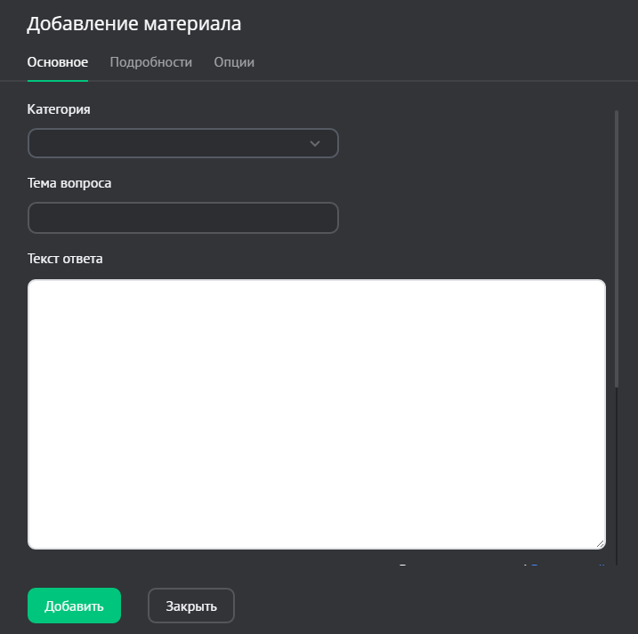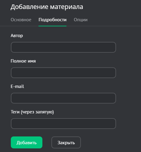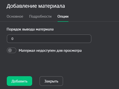 Откроется окно добавления материала, которое содержит несколько вкладок: «Основное», «Подробности», «Опции».