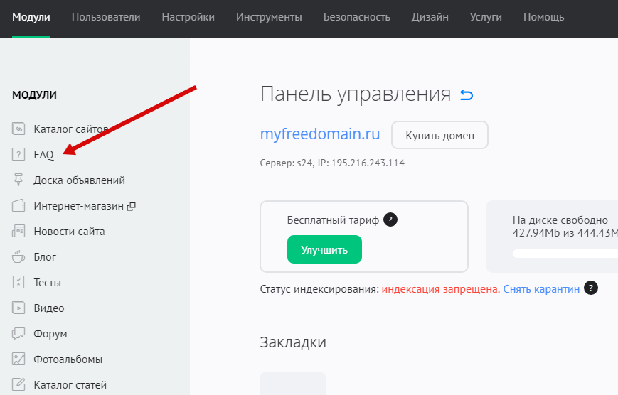 В панели управления сайтом выберите модуль «FAQ» из списка: