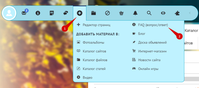 Панель инструментов содержит раздел, который позволяет быстро переходить к добавлению материалов на сайт. Нажмите на иконку «+» и выберите модуль, в который хотите добавить материал: