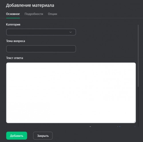 Заполните информацию о материале и нажмите на кнопку «Добавить». Новый материал будет добавлен в «FAQ».