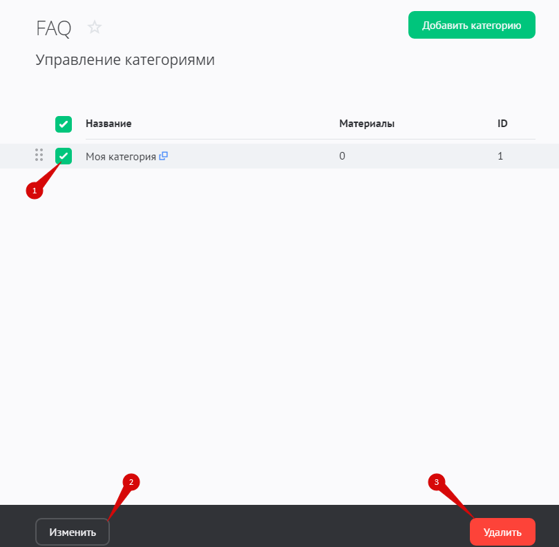 После добавления категории у вас может появиться потребность изменить ее или удалить. В панели управления сайтом перейдите в раздел модуля «FAQ» / «Категории» и отметьте категорию в списке. Затем выберите желаемое действие: