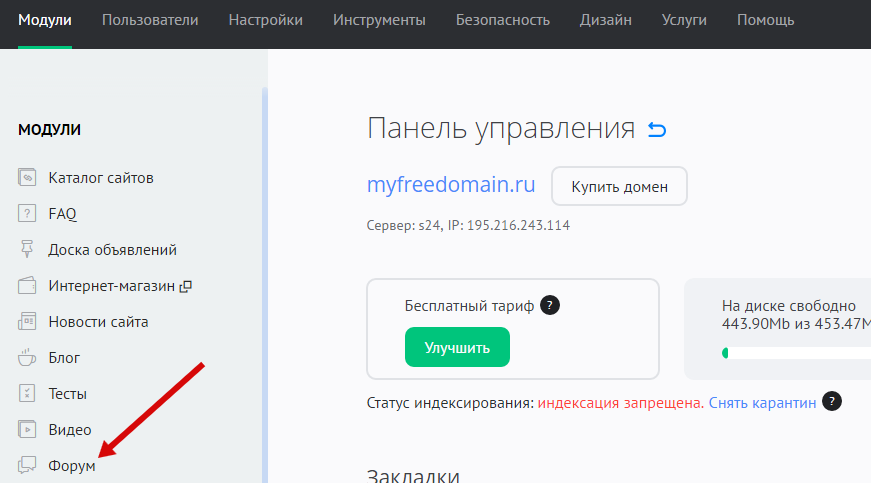 Стандартное имя модуля forum может быть изменено после оплаты любого тарифа, кроме «Базовый».