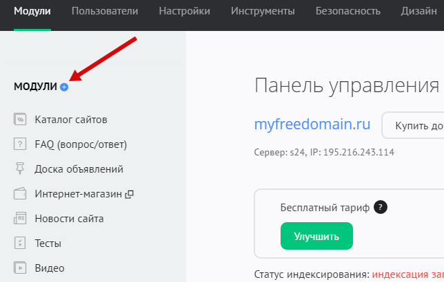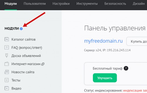 Чтобы подключить модуль, войдите в панель управления сайтом. На главной странице панели в левой колонке «МОДУЛИ» нажмите на изображение «+»: