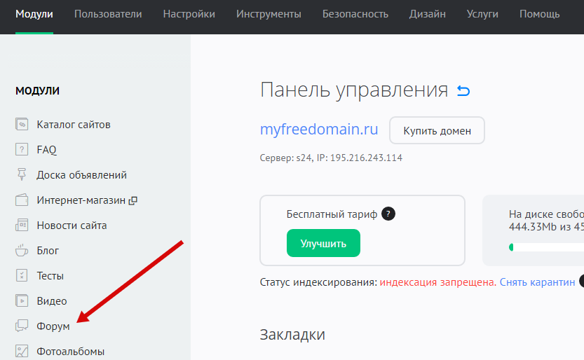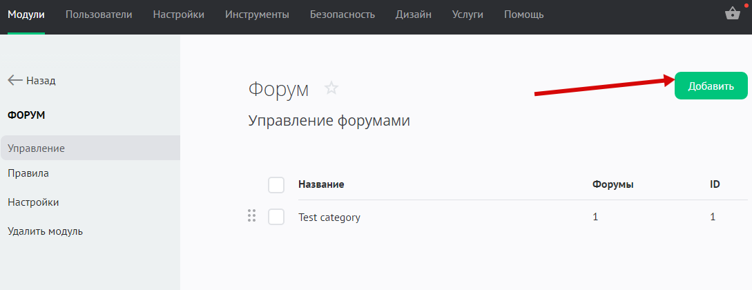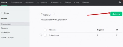 Чтобы перейти к управлению разделами, в панели управления сайтом откройте модуль «Форум»: