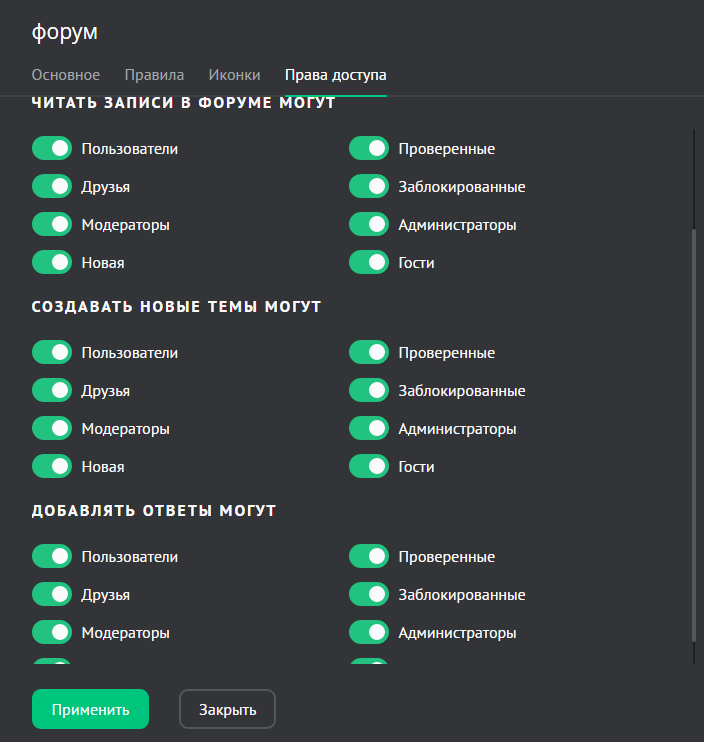 - Читать записи / Создавать новые темы / Добавлять ответы. Данные опции позволяют индивидуально для конкретного форума настроить права доступа для разных групп пользователей. Все опции, отмеченные на вкладке «Права доступа», распространяются только на тот форум, который будет создан.