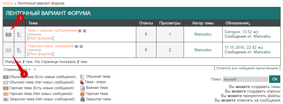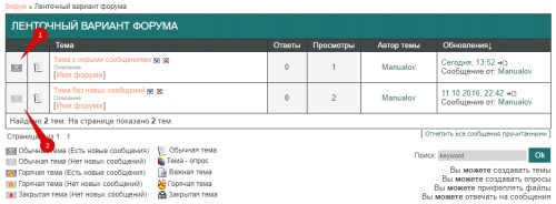 Данные настройки позволяют задать свои иконки для тем. Иконки отображаются в списке тем на страницах форума: