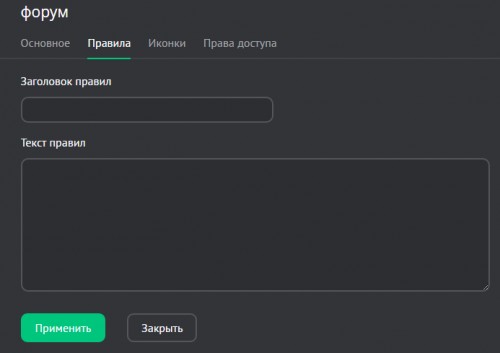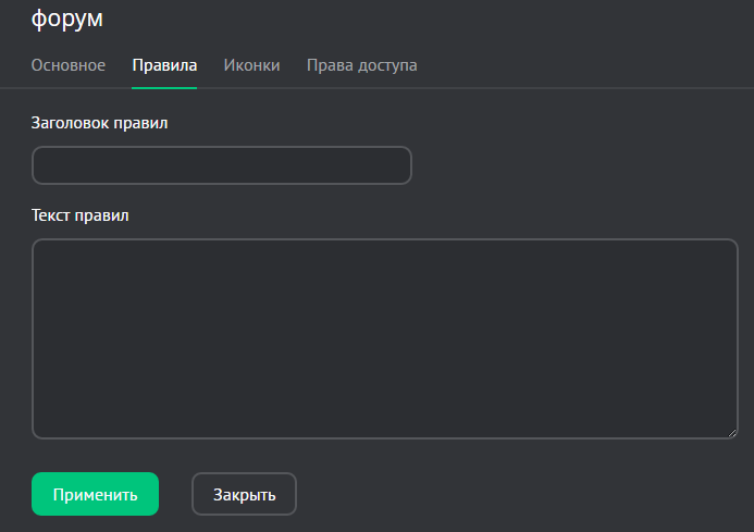 - Текст правил. Отображается на странице правил раздела, например: //example.com/forum/N-0-0-36, где N — ID раздела.