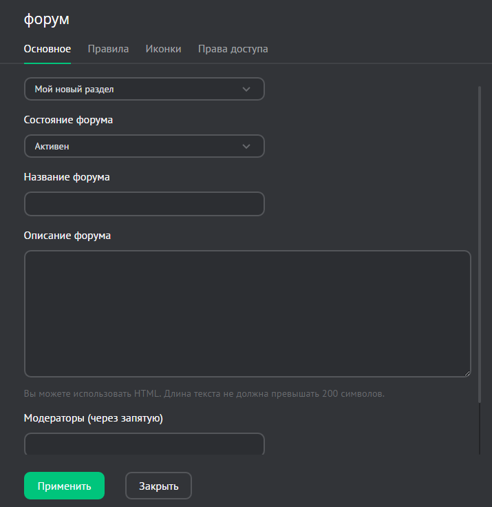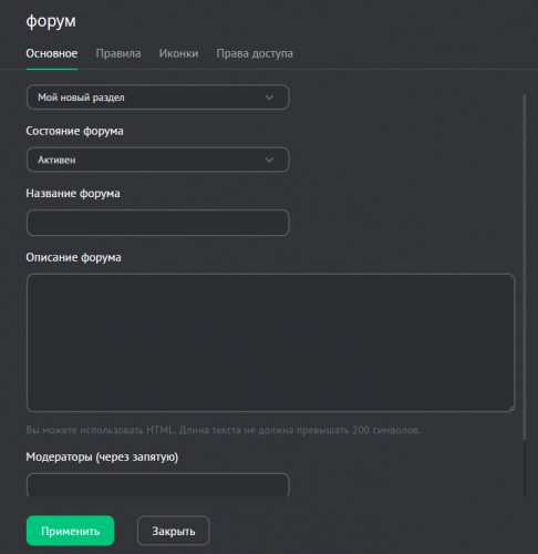 Когда вы нажмете на кнопку «Добавить» из корня структуры форумов, появится окно добавления раздела. Об этом скажет надпись в заголовке окна «Раздел»: