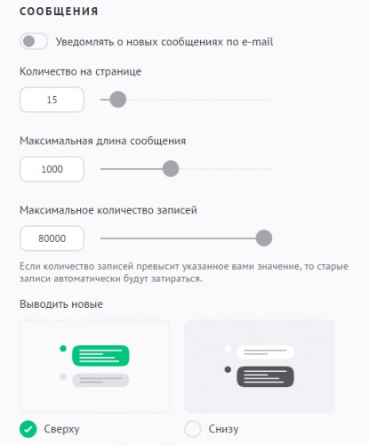 - Уведомлять о новых сообщениях по e-mail. Когда пользователь добавляет новое сообщение, на email администратору приходит уведомление об этом. Это удобно, если есть необходимость в оперативном реагировании.
