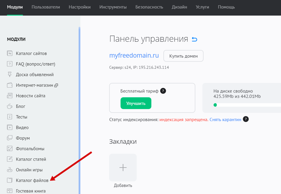 Чтобы подключить модуль, войдите в панель управления сайтом. На главной странице панели в левой колонке «МОДУЛИ» нажмите на изображение «+»: