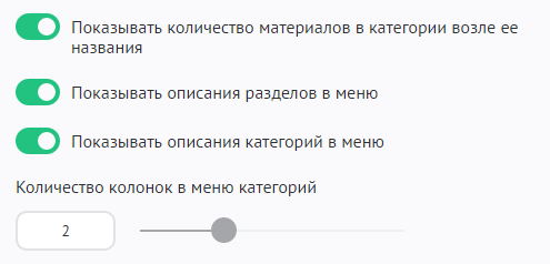 - Показывать описание категорий в меню. Эта настройка влияет на меню категорий, которое выводится с помощью переменной $CATEGORIES$ на страницах разделов модуля.