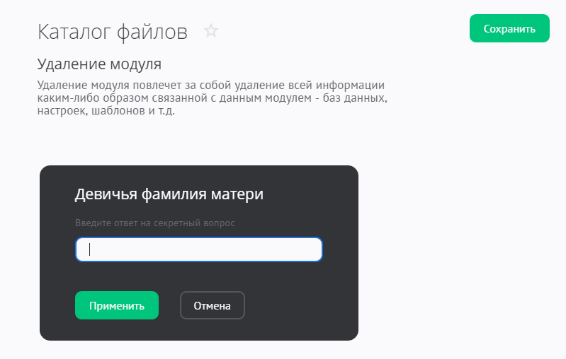 Для удаления модуля потребуется ввести ответ на секретный вопрос: