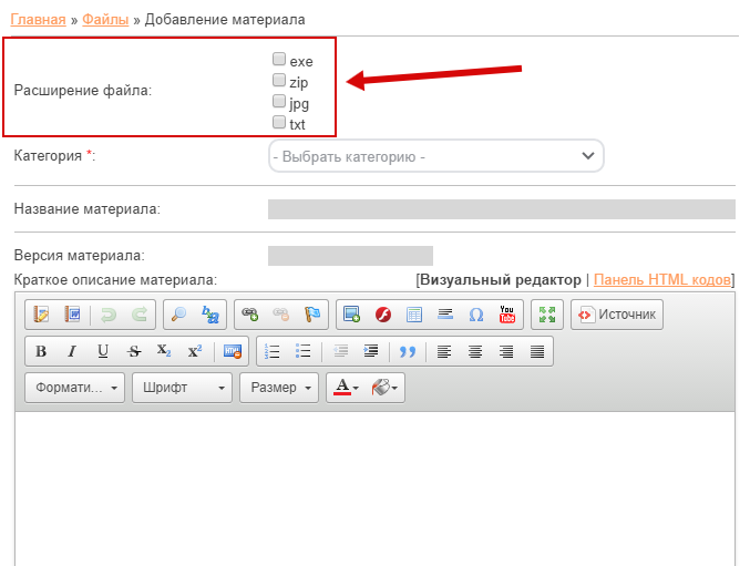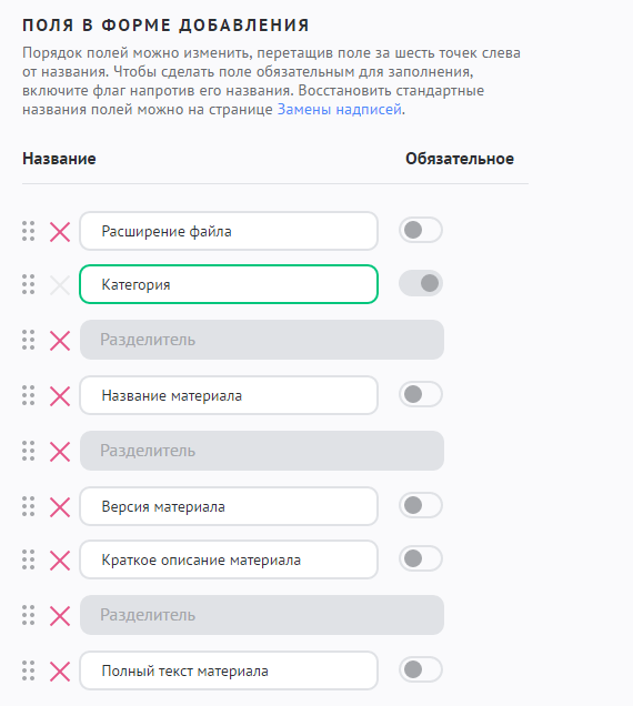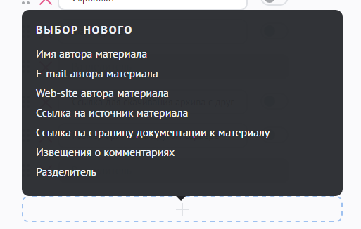 В данном разделе указываются поля, которые отображаются при добавлении материала.