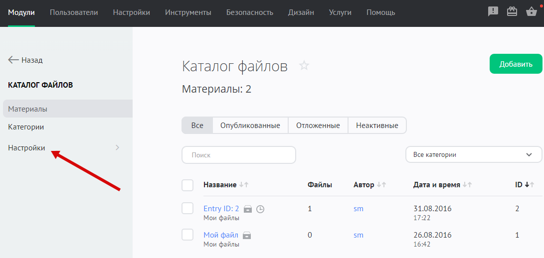 В панели управления сайтом в списке модулей выберите «Каталог файлов» и на открывшейся странице в меню слева нажмите на пункт «Настройки»: