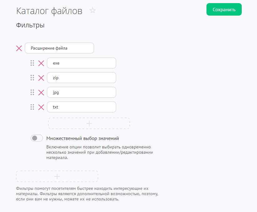 Опция «Множественный выбор значений» позволит на странице добавления файлов выбирать несколько значений фильтра: