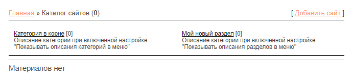 - Показывать описание разделов в меню. Эта настройка влияет на меню разделов, которое выводится с помощью переменной $CATEGORIES$ на главной странице модуля.