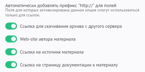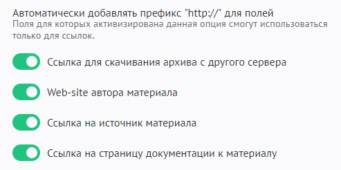 Поля, для которых активизирована данная опция, смогут использоваться только для ссылок. Для добавления префикса доступны следующие поля: