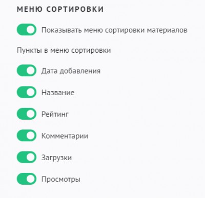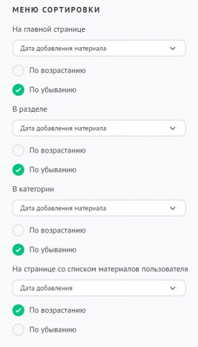 Раздел позволяет настроить отображение меню сортировки на страницах категорий. Чтобы меню отображалось на сайте, включите настройку «Показывать меню сортировки материалов». Ниже укажите поля, по которым пользователи смогут сортировать материалы модуля.