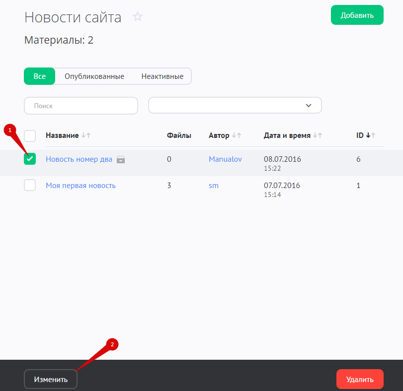 Для редактирования новости отметьте ее и нажмите на кнопку «Изменить»: