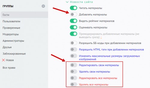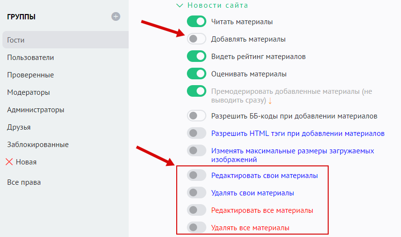 Все кнопки на панели модератора присутствуют в соответствии с правами групп пользователей. Их можно изменить в разделе «Пользователи» / «Группы»: