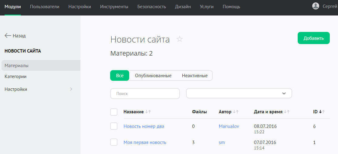 Управление добавленными на сайт новостями выполняется в разделе «Модули» / «Новости сайта» / «Материалы»: