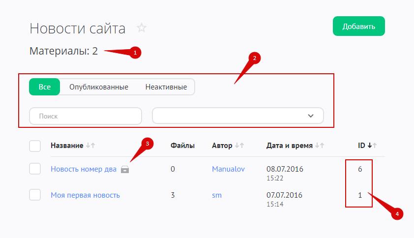 - Колонка с уникальными номерами новостей (ID). Каждая новость получает уникальный идентификатор в порядке возрастания. Даже если удалить новость, новый материал не сможет получить этот ID.