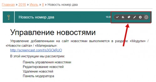 - Индикатор «Премодерация», говорящий о том, что новость не опубликована.