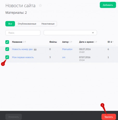 Чтобы удалить одну или несколько новостей, отметьте их в списке и нажмите на кнопку «Удалить»: