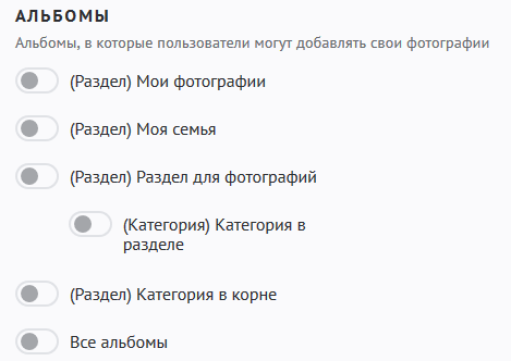 Чтобы задать категории, в которые пользователи смогут загружать свои фотографии, перейдите в настройки модуля «Фотоальбомы» и в разделе «Основные» найдите пункт «Альбомы»: